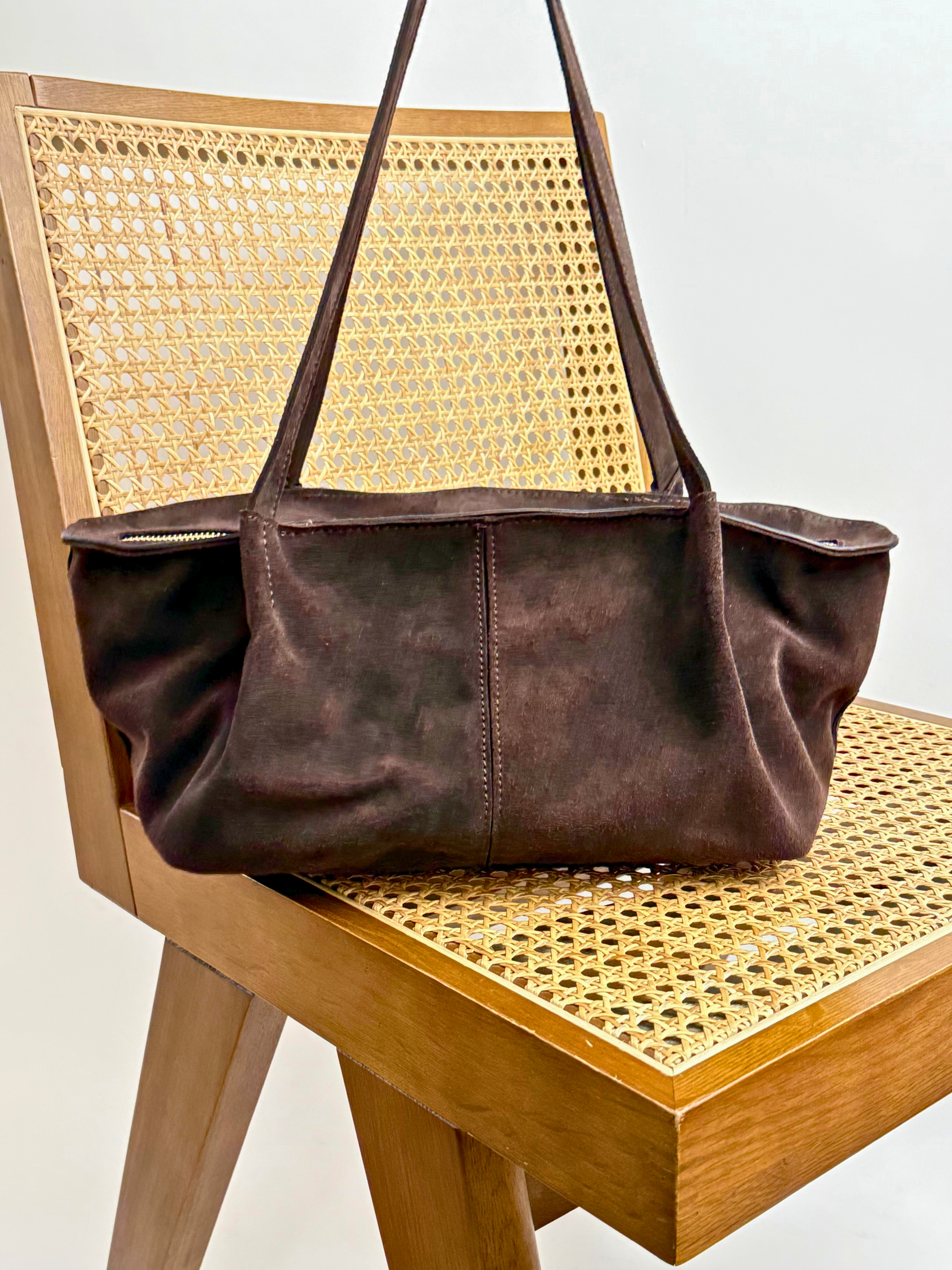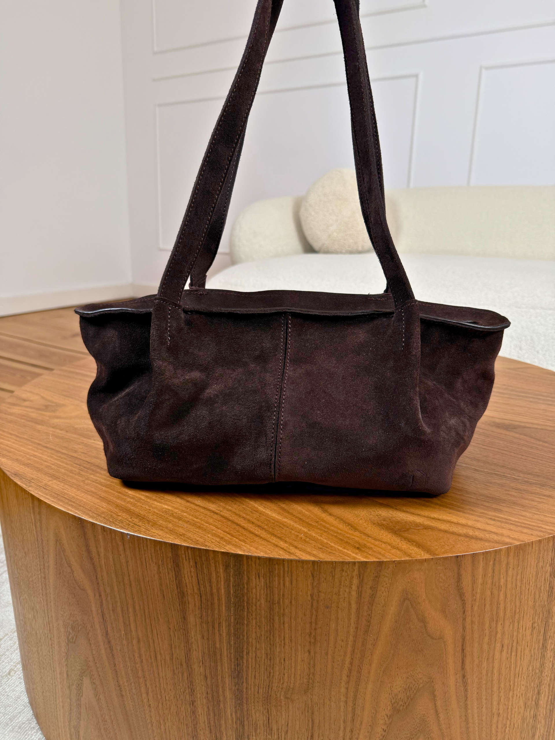 Wykonana z naturalnej skóry zamszowej w odcieniu ciemnej czekolady, zachwyca głębią koloru i miękkim wykończeniem, które dodaje całości luksusowego charakteru.